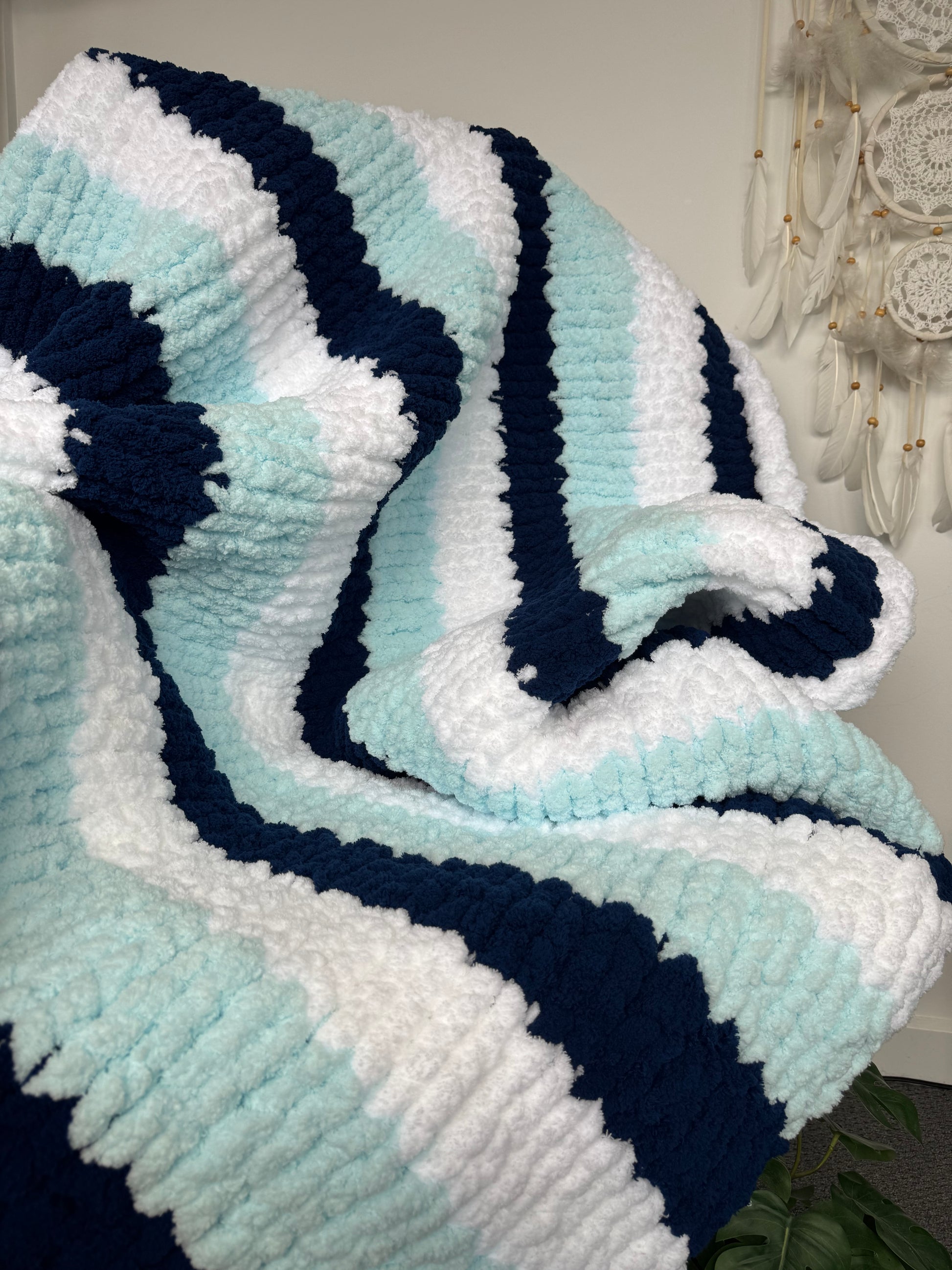 Handmade Chunky Knit Blanket – Blue & White Strip Pattern
